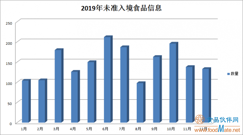 按月統計發現,6月、10月、7月、3月未準入境食品數量居多,分別有212批次、196批次、187批次、180批次。具體每月未準入境食品數量見下圖: